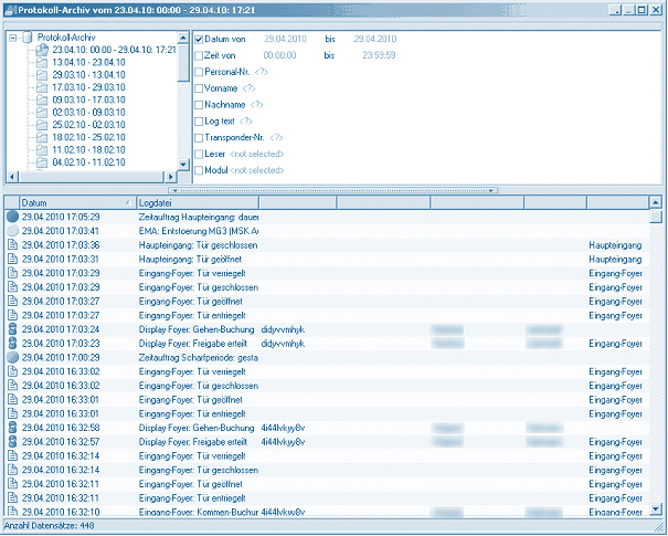 Die Protokolleinträge des MULTIMASTER®-Systems können in Echtzeit mitgelesen oder in den Archivdatenbanken gesucht werden. Möglichkeit zur Begrenzung der Anzahl der zu speichernden Protokolleinträge über einen frei konfigurierbaren Ringspeicher. Die Protokolleinträge können gedruckt oder zur Weiterverarbeitung exportiert werden.
